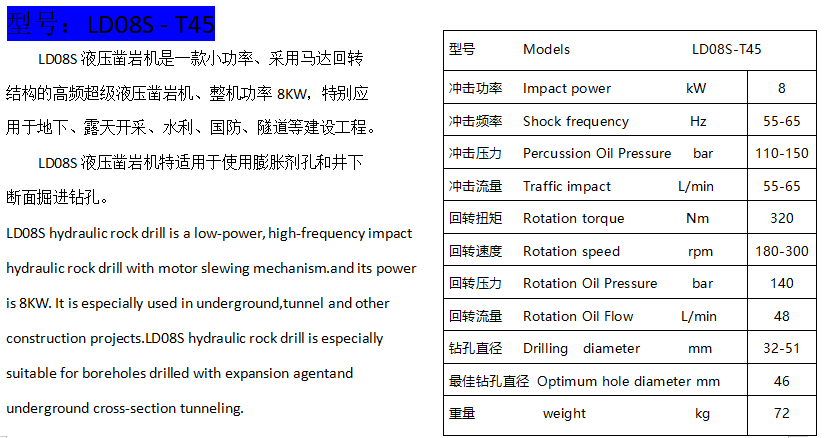 LD08S 液壓鑿巖機(jī)特適用于使用膨脹劑孔和井下斷面掘進(jìn)鉆孔。